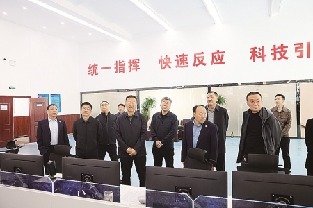 调研中,张海文一行查看了调度指挥中心,通过实时监控系统,详细了解了人员分布、设备运行状态、开采进度、运输工作等井下生产作业情况,听取了煤矿负责人有关生产经营和安全生产工作情况的汇报,对煤矿的安全生产管理情况进行深入了解。