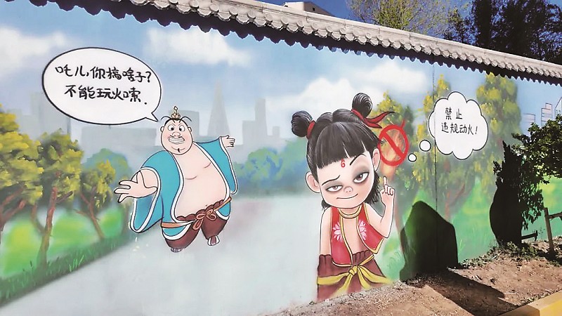 阳泉消防联合阳泉市大连街管理服务中心天峰社区,创新打造了一组以“哪吒”为主题的消防彩绘文化墙,总面积达 200平方米,吸引众多市民驻足打卡,成为城市一道亮丽的风景线。