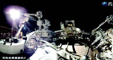 北京时间2025年5月22日16时49分,经过约8小时的出舱活动,神舟二十号乘组航天员陈冬、陈中瑞、王杰密切协同,在地面科研人员配合支持下,航天员从核心舱节点舱出舱,将前期已通过货物气闸舱出舱并利用机械臂转移至中转位置的空间碎片防护装置,安装至预定位置,同时开展了舱外设备设施巡检及处置等任务。出舱航天员陈冬、陈中瑞已安全返回天和核心舱,出舱活动取得圆满成功。
