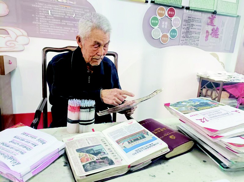 王珍是一位党龄71年的老党员。他热爱读书看报,退休后,报纸、杂志成了他的“老伙伴”。“刚开始,我们很好奇他拿这么多报纸杂志做什么,上前询问,他便拿出了自己做的手工剪贴册给我们看。我们这才知道,原来老人已坚持读报、剪报、写感想多年。”铁北社区书记兼主任韩雪告诉记者。“我坚持做这件事十余年了,自从有了这个爱好,扑克也不打了,有时间就看报纸,把国家大事、民生实事等一些重要新闻,以及我认为很有意思的报道剪下来,贴到册子上,有时我还会写一些感想。”王珍边翻手工剪贴册边介绍。“全球安全倡议,共同守护世界和平、安全、稳定;熬粥:熬粥时,稍不注意便会溢锅,如果往锅里加5—6滴植物油或动物油,就可避免溢锅。”记者随意翻开一页,只见王珍的读报感想字迹工整、条理清晰,更像一个简单的手抄报。“这些年粘贴报纸用了多少瓶糨糊?”一位老人打趣地问道。“那可说不来。不过,节约光荣浪费可耻,我用得多但从来没浪费过。”王珍笑着回答。
