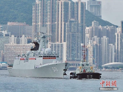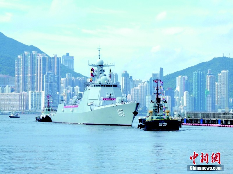 ① 7月3日上午,编队属舰湛江舰、运城舰停靠昂船洲军营码头。图为湛江舰进入昂船洲军港。