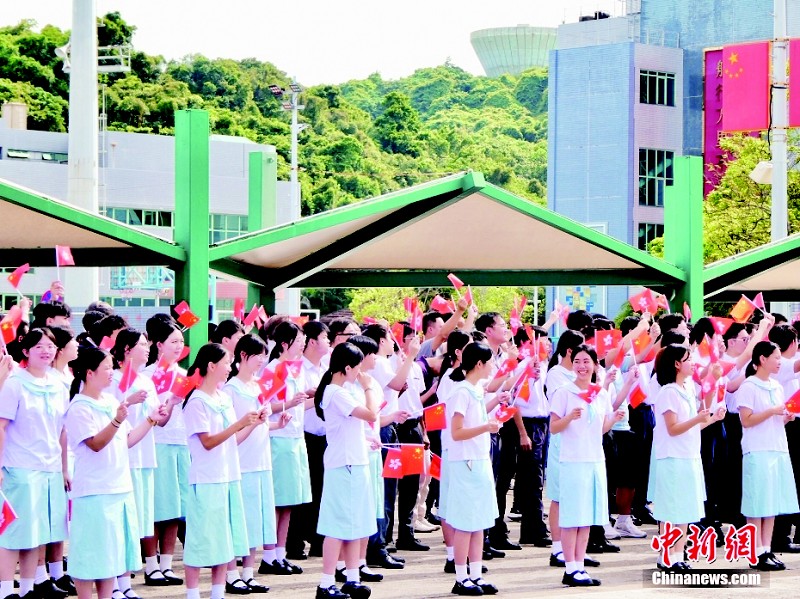 ④ 图为香港青少年挥舞国旗和香港特区区旗,欢迎湛江舰和运城舰。 据中新社