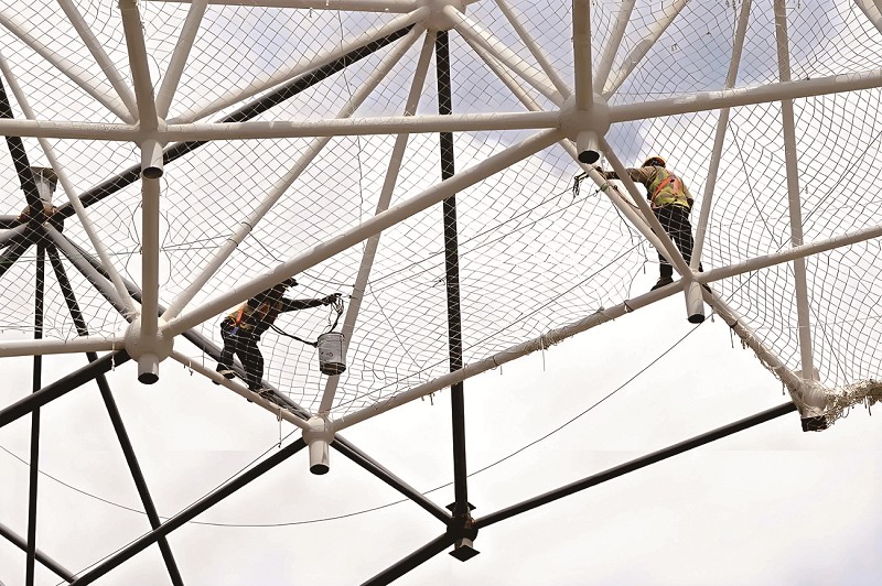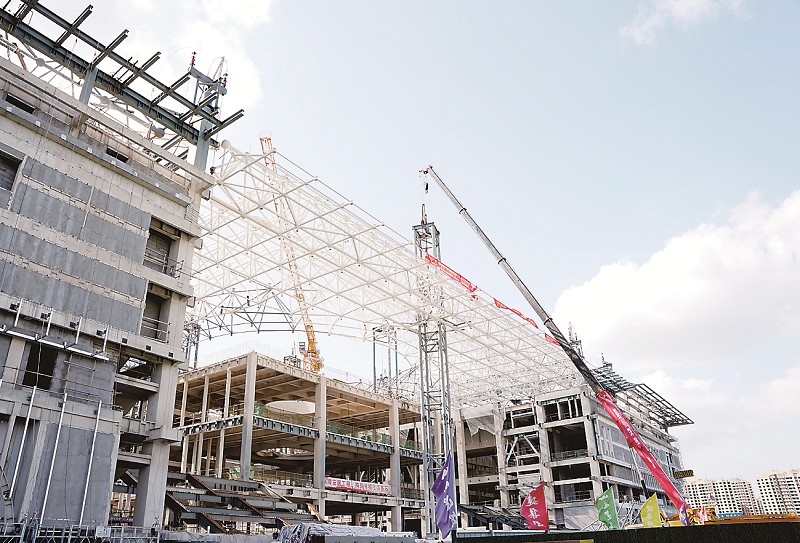 这一创新施工工艺,成功减少了40%的高空作业量,极大地降低了施工风险。同时,施工效率提升了35%,有效缩短了项目工期。提升过程中还运用先进的实时监测装置和传感器分析系统,通过数字化管控,确保网架提升过程的平稳性、安全性。 记者 乔建彬 文/摄