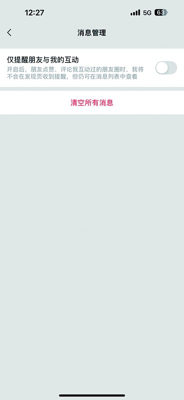 3.进入“消息管理”界面,此时多了一个“仅提醒朋友与我的互动”设置。开启该功能后,朋友点赞、评论你互动过的朋友圈时,将不会在发现界面收到提醒,但仍可在消息列表中查看(该功能目前正处于内测阶段)。