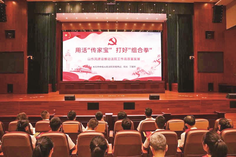 大同中院党组书记、院长丁国华以《用活“传家宝”打好“组合拳”以作风建设推动法院工作高质量发展》为题,结合自身学习认识和体会,带领大家重温习近平总书记关于加强党的作风建设的重要论述,感悟新时代以优良党风引领社风民风取得的历史性成就,对进一步扎实开展深入贯彻中央八项规定精神学习教育,不断加强大同法院作风建设提出要求。