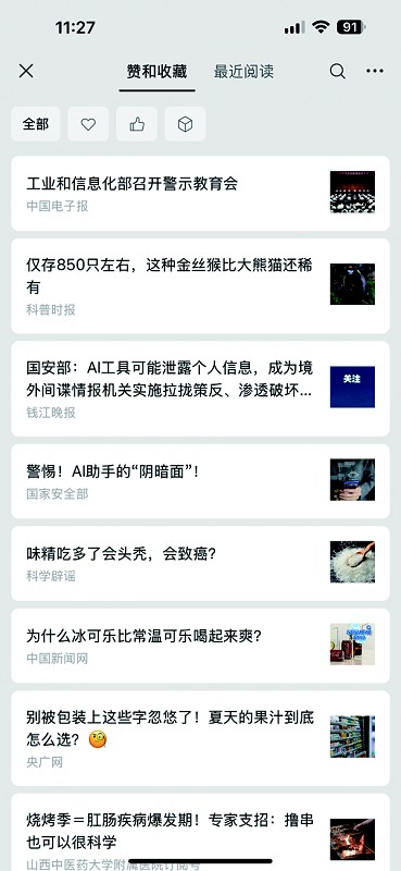 2.该界面设置了“我关注的公众号”“我订阅的合集”“赞、收藏和最近阅读”等功能,点击“赞、收藏和最近阅读”。