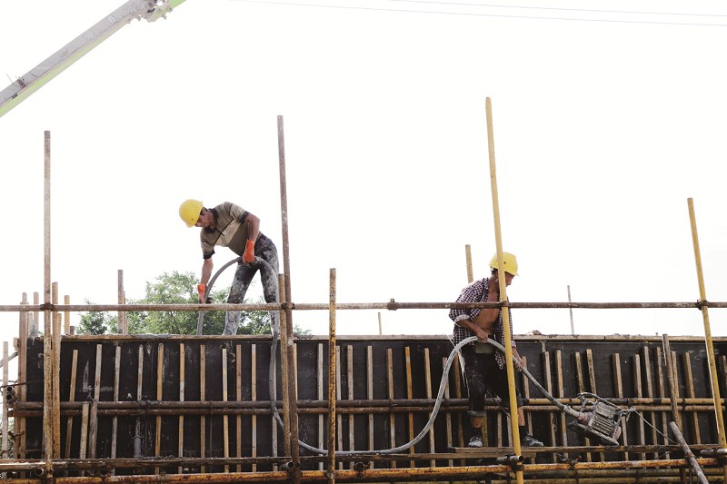 走进该项目建设现场,厂房高耸,施工车辆有序往来,工人有条不紊地进行焊接、顶板安装等作业,泵车精准定位,高效输送混凝土,罐车有序调度,确保浇筑连续不断。“目前,两栋生产车间全部完成主体结构建设,并启动了顶板铺装作业。辅房二次结构进入收尾,综合楼主体完工后正在进行地下通道浇筑。”现场负责人介绍,尽管近期高温和降雨叠加,有100多名建设者仍坚守一线,推进项目建设。