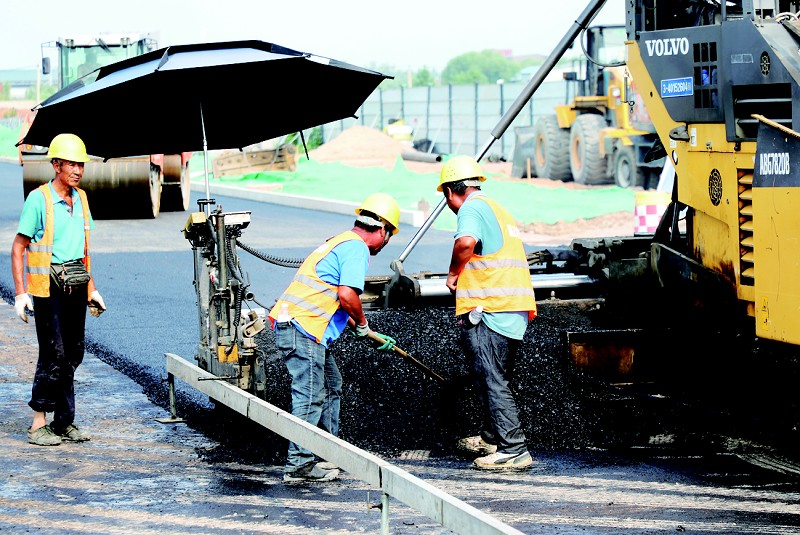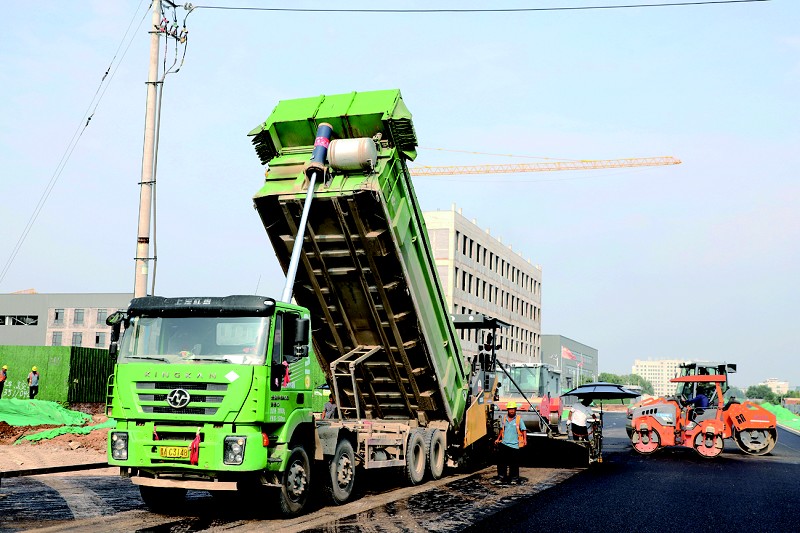 在施工现场,两台大型摊铺机并排缓行,将沥青混凝土摊铺平整,十余名工人手持铁锨,迅速将分散的沥青料均匀地摊铺在路面上。3台压路机紧随其后,道路经过来回碾压逐渐变得平坦坚实。一辆辆装载着沥青混凝土的运输车有序停靠在路边,各项工作有条不紊地推进。“今年5月份入场,我们完成了地下雨污水管线建设和路基铺筑。按照建设计划,预计将在8月中旬完成第二层油面铺设,并启动路灯安装、绿化工程等附属设施。”项目现场负责人介绍,为确保项目顺利推进,项目部在做好现场施工人员防暑降温和安全生产工作的同时,密切关注气象预警信息,加强施工现场动态监测,扎实做好各项汛期防范应对工作。