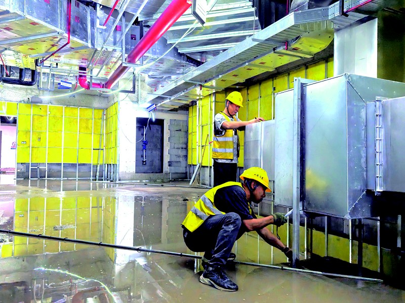 在东指廊机电安装中,安装集团项目团队创新实施网格化管理,将现场划分为56个网格化区域,依托数智建造平台的PDCA循环管理,通过劳动竞赛、工区互学互评、网格化管理等活动,将进度推进、安全检查、质量管控跟踪细化到每个网格区域。在主楼工区的空调机房内,工作人员手持仪器测量管线间距,逐项核查设备标识,墙上的BIM 模型标注着精确到毫米的安装参数。打压试验区域,升降车上闪耀的焊花,与泵房内工人合力搬运设备的号子声遥相呼应。