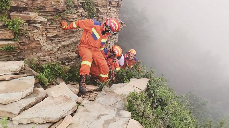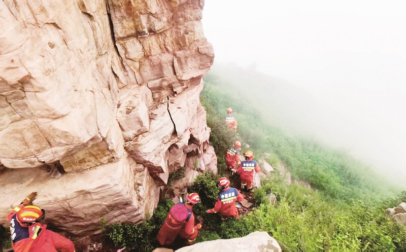 现场勘查发现,该游客被困在离山顶地面约4米高的灌木丛中,周围全是茂盛的植被,能听到他因疼痛发出的呻吟,山顶当时云雾缭绕,视线受阻,无法判断其具体受伤情况,沟壑两侧为裸露岩石与疏松黄土混合的陡坡,且下方是陡峭的悬崖,一旦坠落后果不堪设想。