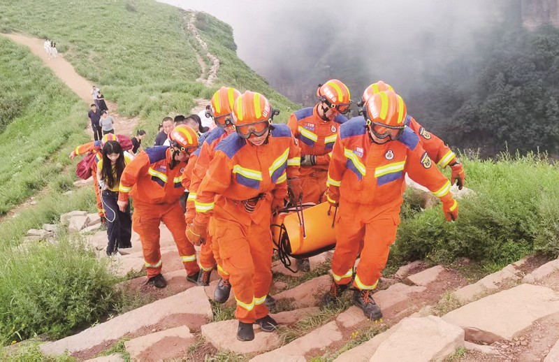 经过20分钟的协同作业,被困游客被成功抬上崖顶。医护人员随即对其进行全面检查,确认无骨折等严重伤情后,消防救援人员又开始一手抬着担架一手抓着保护绳,在雨中深一脚浅一脚地沿着来时陡峭的崎岖山道原路返回至景区出口,将其送上救护车,送往医院进一步治疗。