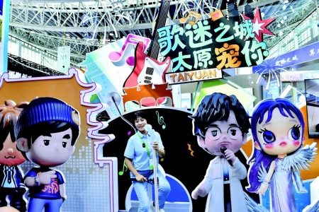 在“歌迷之城”主题展区,有蔡依林、周杰伦、周传雄、张韶涵等知名歌手的公仔立牌,“歌迷之城太原宠你”的宣传口号及跳动的音符为主体的装饰,营造出演唱会的热烈场景。在此处拍照打卡留念的石家庄歌迷老范笑着说:“我刚刚看了刀郎的演唱会,计划参观完文博会,再去山西的几处古迹看看。”