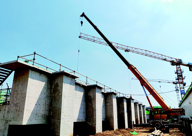 走进施工现场,钢筋工、木工等各工种人员各司其职,巨大的混凝土输送泵管持续运转,将混凝土精准送达作业面。硝化滤池、沉淀池、活性炭吸附池等多个单体高高矗立。