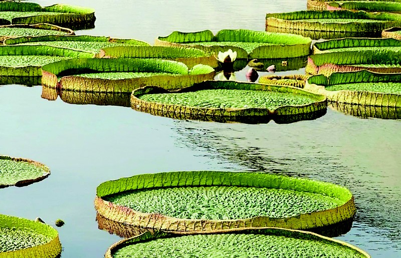 王莲,别名亚马逊王莲,是睡莲科王莲属的一种大型多年生水生植物,叶呈椭圆形至圆形浮于水面,形态奇特,直径1.2—1.8m;花单生,直径最长可达30厘米,常伸出水面开放,第一天为白色,有白兰花香气,第二天花瓣变为粉红色至深红色,至凋落时颜色逐渐加深;花萼密布带有刺,花瓣呈长圆状披针形;果呈球形,种子200—300粒,花果期7—9月。
