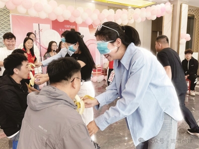 活动全程以互动游戏为主线,首个游戏“击鼓传花”率先点燃热情,随着音乐响起,花束在青年们手中依次传递,音乐骤停时手持花束的青年需起身自我介绍,涵盖基本信息与择偶标准,让彼此快速建立初步了解。一番介绍后,大家的陌生感渐消,默契悄然滋生。“桃花朵朵开”游戏更添欢乐。青年们围成圆圈,在裁判“桃花朵朵开”的指令后齐声询问“开几朵”,并根据报出的数字迅速组队。未成功组队的小伙伴通过才艺展示活跃气氛,歌声、掌声交织成欢乐的乐章。浪漫氛围在“听见爱情”环节中愈发浓厚。经典歌曲片段暂停时,青年们争相奔向话筒接唱下一句歌词,获胜者收获小红花兑换礼品,歌声与欢呼声此起彼伏。“水果连连看”考验默契,2人一组中男生坐于凳上,女生戴眼罩喂其吃水果,吃完后迅速敲锣,前五组成功通关者赢得小礼品,现场画面温馨有爱。压轴游戏“爱在一瞬间”则紧张刺激,分组青年在凳子两侧相对而立,根据口令完成摸鼻子、摸眼睛等动作,当“抢瓶子”指令响起时,大家迅速抢夺中间水瓶,获胜者收获礼品,激烈的争夺让现场笑声不断。