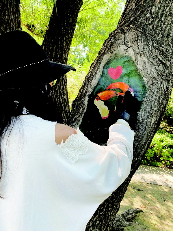 如今,刘宇的自媒体账号已更新不少树洞画作品,每一幅都记录着她在迎泽公园的创作时光。“树洞画作为一种街头艺术,用小小的画笔,让树木的伤口开出了治愈的花朵,在艺术和自然、城市与生态间架起一座斑斓的桥梁。能通过画笔美化城市,让大家路过时会心一笑,点亮心情,这太有意义了。”刘宇说,自己将继续在迎泽公园树洞上作画,为城市增添一些靓丽的艺术色彩。