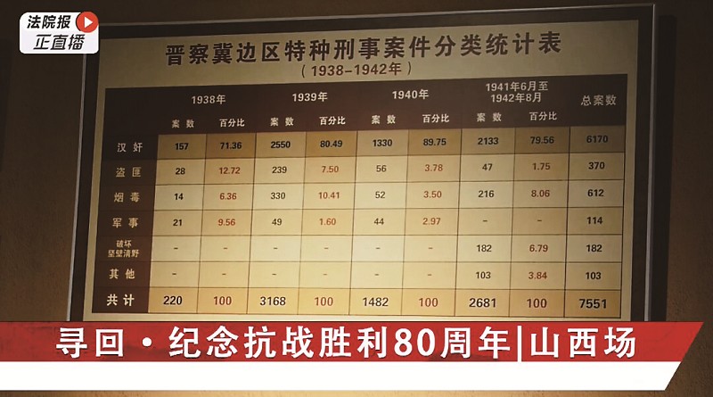 抗战爆发后,中日民族矛盾成为社会主要矛盾,司法工作的主要任务是服务抗战大局。抗战时期,严重破坏抗战活动的犯罪被确定为特种刑事犯罪,主要包括汉奸特务,贪污腐化,行使、运销假冀钞,盗毁空室清野财物及毒品犯罪等。“山西抗日根据地司法档案文献选展”展示的晋察冀边区特种刑事案件分类统计表(1938年-1942年)就清晰地反映了汉奸、盗匪、烟毒、军事、破坏坚壁清野等犯罪案件的数量和占比情况。