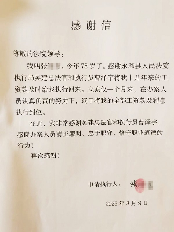 一面锦旗,一封感谢信,既是人民群众对法院执行工作的肯定,更是对执行干警的激励和鞭策。永和法院高效便民执行工作也是赢得了78岁老人的点赞。“感谢永和法院执行局吴建忠法官和执行员曹泽宇,将我十几年来的工资款及时执行回来……”信中短短一百七十余字,字里行间表达了对执行局干警高效执行、恪守职业道德的感激之情。