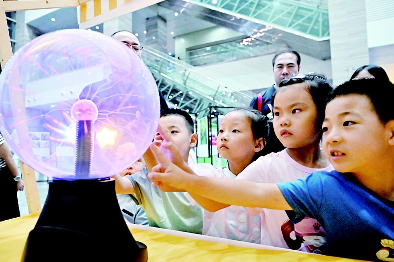 除了聪明的“饮水鸟”,辉光球也吸引了很多孩子的目光。只见孩子们小心翼翼地伸出手,轻轻触碰散发着神秘光芒的辉光球。刹那间,一道道绚丽多彩的光线随着手指的触碰而舞动,仿佛被赋予了生命一般。“哇,好神奇啊!”一个男孩忍不住惊叹道。工作人员笑着解释:“这个辉光球的工作原理其实和电场、气体放电有关。球内填充了特殊的气体,当我们用手触碰球体时,就相当于在球内引入了一个电极,使得球内气体发生电离,从而产生了美丽的光线。”孩子们听得津津有味,有的还忍不住一次次地伸手触碰,想要更深入地感受这奇妙的科学现象。