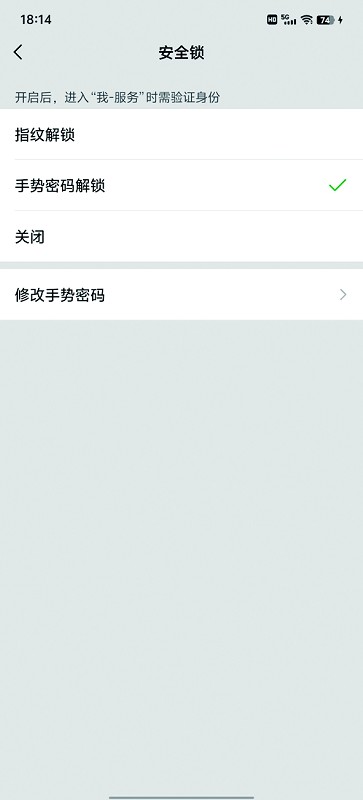 4.在该界面,选择“安全锁”,可以看到“指纹解锁”“手势密码解锁”两种解锁方式,根据自己的使用习惯选择一种解锁方式,验证身份并设置好解锁方式后,安全锁功能就开启了。
