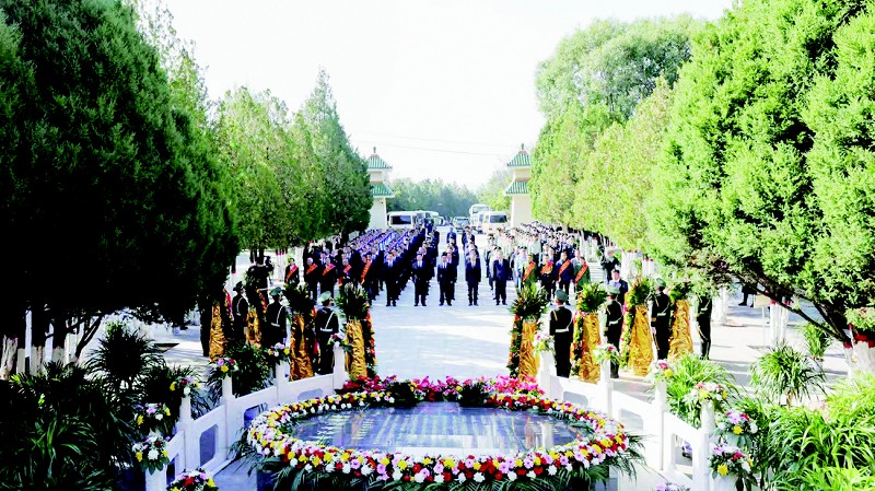 仪式现场,奏《烈士纪念日号角》,礼兵行进到位,全体肃立,奏唱《中华人民共和国国歌》;全体人员脱帽向为祖国和人民英勇献身的烈士默哀;少先队队员唱响《我们是共产主义接班人》;伴随着《献花曲》,两名礼兵抬起花篮,缓步走向革命烈士纪念碑,将花篮摆放在烈士碑前,孙大军缓步向前,仔细整理花篮缎带,表达对革命先烈的无尽怀念和无限敬仰。最后,全体人员瞻仰了革命烈士纪念碑并向烈士墓献花,虔诚祭奠革命先烈的不朽英魂。