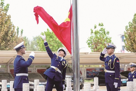 为热烈庆祝中华人民共和国成立76周年,10月1日上午,我省消防各级单位举行了升旗仪式。