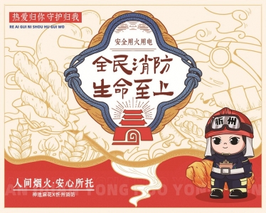例如,忻州消防与本土产品的联名设计中,以“消防公益+忻州地域文化+本土产品 (酸奶/麻花)”为核心打造系列化文创产品,实现了科普、文化、联名的多维价值。以忻州特产神池麻花为例,其核心概念是烟火守护+麻花烟火,寓意消防筑防。在其视觉核心,中间是如意形绳结主题框 (消防救援绳结缠绕麻花绞纹,内嵌标语+古城门),暗含平安寓意;右侧消防IP手持麻花,姿态亲和;背景有麻花+小麦束+胡麻植株,以及老式铸铁炒锅+迷你干粉灭火器,完整呈现了“原料-制作-安全”的烟火场景。