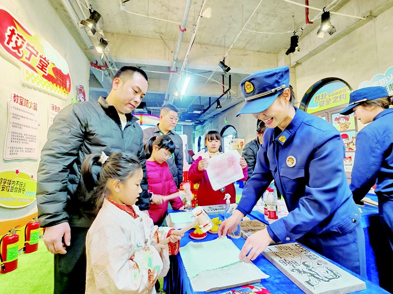 在这个区域,大家可以欣赏融入了消防元素的珐琅画、剪纸、煤雕等精美非遗作品。同时,还可以在非遗传承人指导下,亲手制作消防主题的皮影、拓印或漆扇。