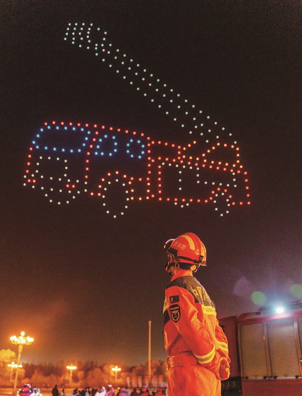 这场无人机灯光秀活动,以科技为笔、光影为墨。夜幕降临,无人机编队从城市地标腾空而起。随着光影流转和音乐节奏的变换,夜空中先后浮现“安全用火用电”“防患于未然”“灭早灭小”等贴心提示,以及消防徽、消防救援人员“逆行身影”、“119”应急密码、消防云梯车的动感造型,最终勾勒出“平安回家”字样,定格在“敬礼”。光影交织间,硬核科技与消防安全理念深度融合,既带来强烈的视觉震撼,又让市民在沉浸式体验中牢记安全知识。