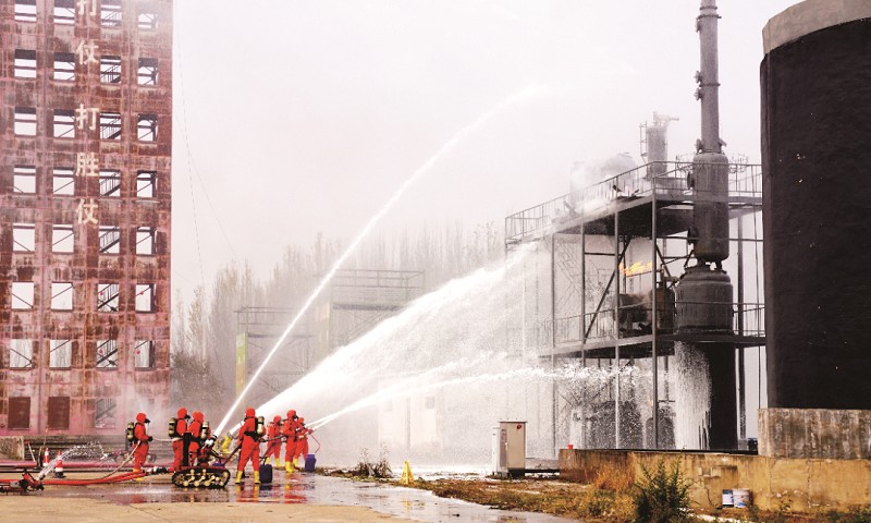 119消防宣传月活动现场,与会人员观摩了化工装置火灾事故处置实战演练。演练中,通过现场侦察、安全管控、稀释冷却、带压堵漏等一系列有序、科学的处置,出动水罐消防车、消防灭火机器人、水幕水带、固定式消防炮,采取“技术侦检、高空打击、远程控制、综合保障、立体合围”的战术措施,泄露的管道被成功堵漏,演练取得圆满成功。