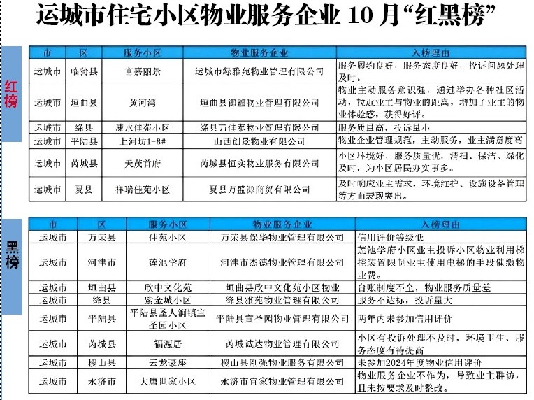 运城市住宅小区物业服务企业10月“红黑榜”