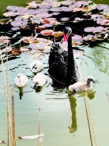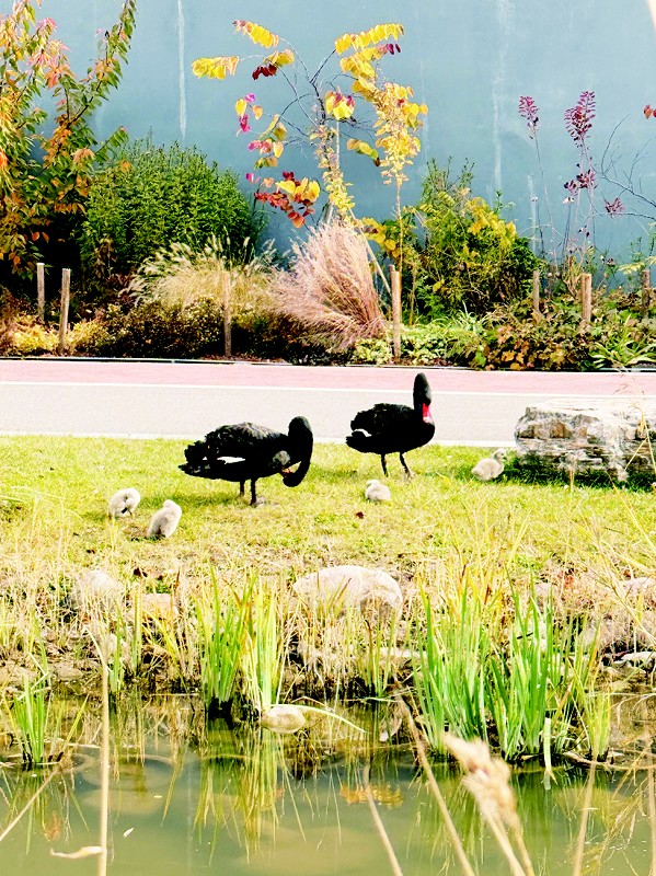 而在园内好问湖上,此前两组已成功孵化的黑天鹅家庭正在水里欢快地游弋,成为初冬时节太原植物园里最动人的风景线。
