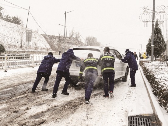 结冰路面举步维艰 “火焰蓝”化身“推车人”
