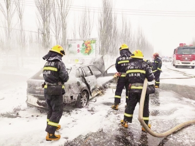 7时46分,阳高县消防救援大队接到报警后,迅速调派3辆消防车、11名指战员,顶风冒雪赶赴现场处置。到达现场后,消防指战员立即展开灭火行动,采取单干线出两支水枪的方式,对起火车辆进行扑救。低温与积雪给救援带来一定挑战,指战员们全力防止火势蔓延,并确保作战安全。经过消防人员奋力扑救,明火很快被成功扑灭。随后,消防员对现场进行仔细清理,防止复燃。