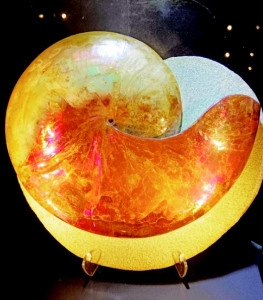 再看另一位宝石“大佬”——斑彩螺。斑彩螺又名斑彩石或者斑彩菊石。它并不是蜗牛或者螺,而是已灭绝的一种头足动物——菊石。菊石是几千万年前的海洋中的“老玩家”了,也是大家口中美味的“铁板鱿鱼”或“章鱼小丸子”的老祖。这些海洋中的“老前辈”曾在中生代与恐龙一起繁盛,但在白垩纪末期又和恐龙一起被“注销账号”了。