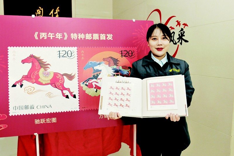 《丙午年》特种邮票1套2枚,分别是“驰跃宏图”“万骏臻福”,面值均为1.2元,邮票规格为36毫米×36毫米。“驰跃宏图”以“腾跃新时代”为核心意象,展现一匹红马奔驰于祥云之上,鬃毛如焰、四蹄生风,象征“一马当先”的开拓气概;“万骏臻福”通过展现三匹奔跑的骏马,寓意“奔腾不息、共同奋进”的团结力量,背景及马身辅以祥云纹、火焰纹、缠枝纹等传统吉祥纹样,既隐喻福运连绵,又强化东方美学底蕴,将马的形象与新时代中国人民奋发进取的精神风貌完美融合。该特种邮票采用胶雕套印,通过防伪纸张、防伪油墨、异形齿孔、荧光喷码方式进行防伪。《丙午年》特种邮票是中国邮政自1980年发行生肖邮票以来,首次通过全社会征稿、大众评审投票与专家评审相结合的方式产生,这标志着生肖邮票设计进入“全民共创”的时代。