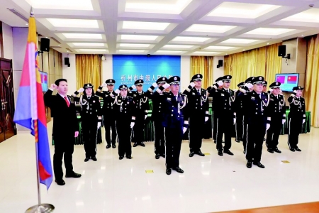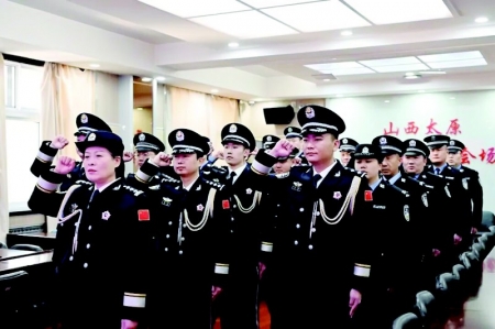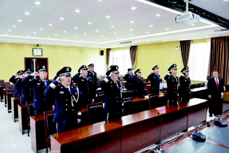 9时,在省高院主会场,42名司法警察身姿挺拔、整齐列队。大家面向警旗、庄严宣誓:对党忠诚、服务人民、执法公正、纪律严明。
