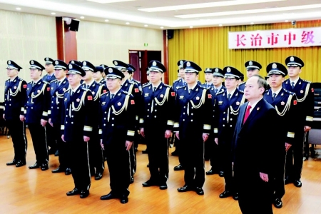 朔州中院、晋城中院、清徐法院、平定法院、古县法院、河津法院、吉县法院向从警10年、20年、30年司法警察颁发从警纪念章,向退休司法警察颁发退休荣誉章,并表示祝贺。