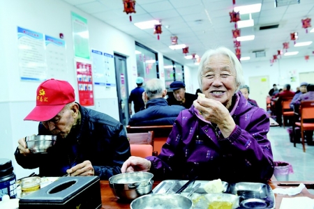 94岁的冯奶奶是入住中心自理区年龄最大的一位老人。到了饭点,在护理人员的照顾下,冯奶奶和其他老年人从公寓楼前往餐厅吃饭。萝卜条炖肉、清炒土豆丝……很快,护理人员为冯奶奶端来了营养丰富、味道可口的饭菜。“每顿饭菜都不重样,味道香着哩。”冯奶奶边吃边夸赞。“这里还有洗衣房、理发室、阅览室、健身房等各种功能室,在生活方面,我们尽量从老年人出发,努力让他们感受到家的温馨。”赵自兴说。