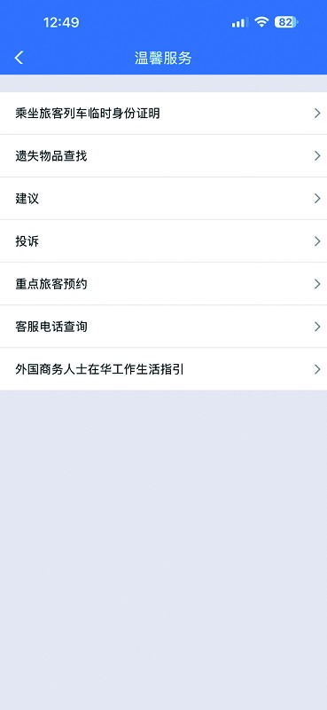 2.页面跳转后,在“温馨服务”应用界面中点击“乘坐旅客列车临时身份证明”。